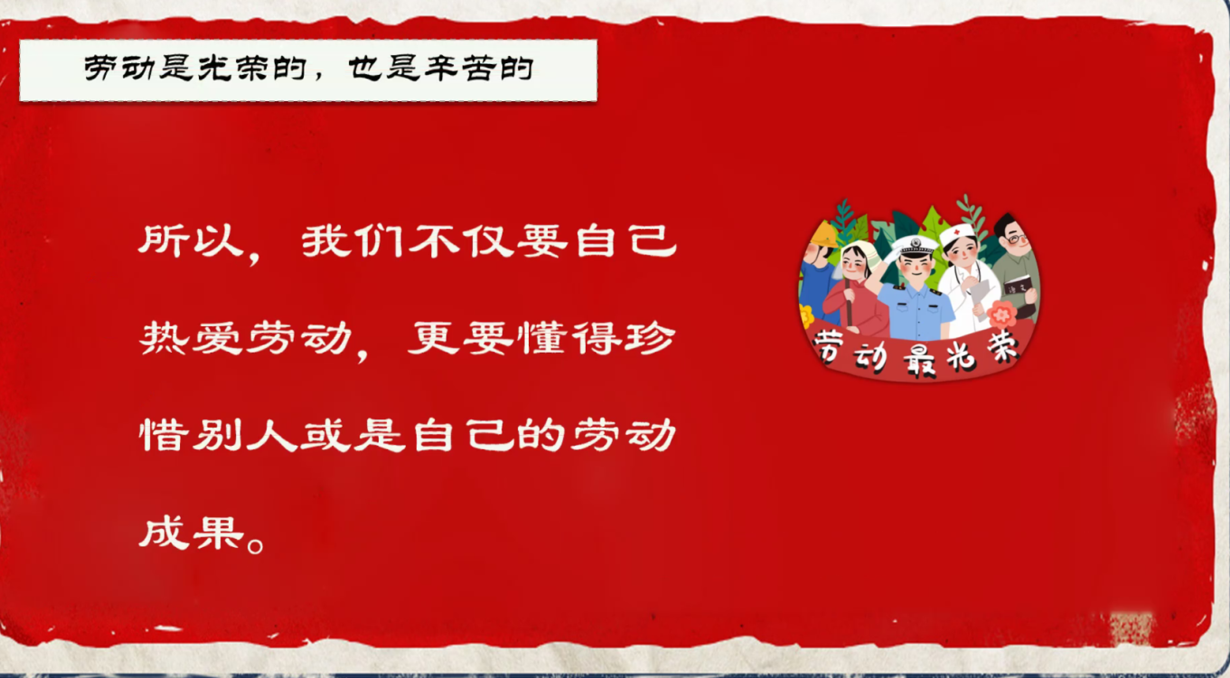 会上,同学们先行观看了视频《中国梦·劳动美——致敬最美劳动者》《你的奋斗终将伟大》,了解劳动模范们的故事,深刻理解劳模精神和工匠精神,并围绕 “什么是劳动教育”“劳动教育的意义”“老员工如何实现劳动价值”等三个问题开展讨论;会后,大家分享了身边优秀的劳动榜样,承诺今后将向榜样学习,向榜样靠拢,养成热爱劳动、尊重劳动的好习惯,并在劳动中接受锻炼,磨练意志、强化责任担当。