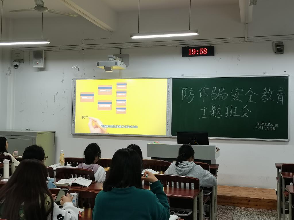 为提升同学们的防骗防诈意识,2021年3月18日,公司2020级利用晚自习开展了反诈骗主题班会,班会由各班文体委员组织。