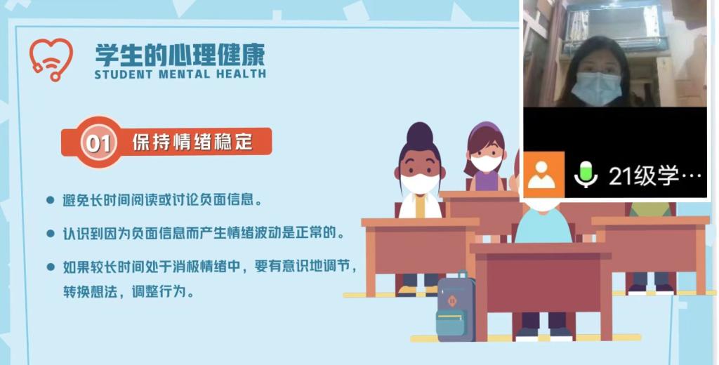 首先,2021级学科教学(语文)1班团支书陆云婷向同学们介绍了心理健康的表现、重要意义,并列举了导致现阶段研究生感到焦虑的几大原因,就这些原因给出了五条切实可行的建议,帮助同学们“对症下药”。