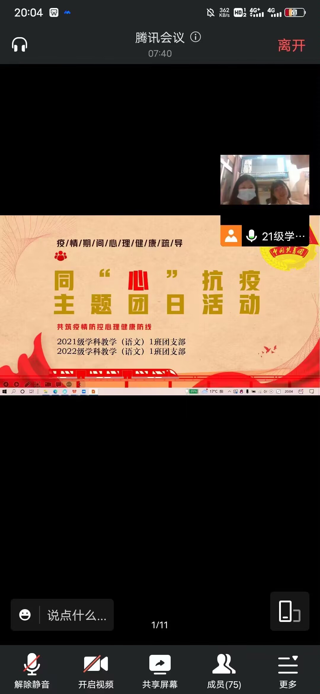 当前,重庆疫情形势仍然严峻。为减轻同学们疫情防控期间的心理压力、缓解同学们紧张焦虑的情绪,以积极乐观的心态迎接这一阶段的生活和学习,11月18日晚上8点,公司2021级学科教学(语文)1班与2022级学科教学(语文)1班联合举办了线上“心理健康”主题团日活动。