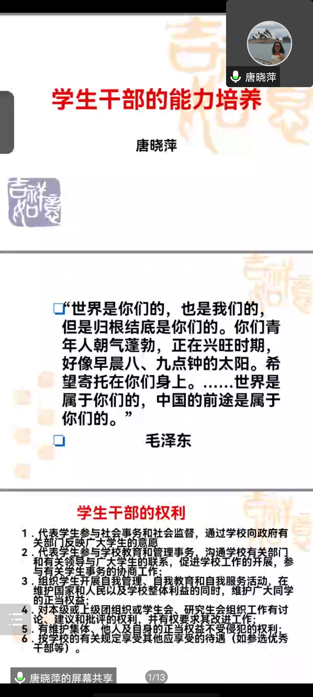 会上,唐晓萍书记主要从员工干部的权利、义务、基本能力、与辅导员的关系四个方面展开讲座交流,教导各位员工干部要努力提高各项能力,提升思想境界,坚持遵守为老师分忧,为同学服务,恪尽职守,服务公司的理念原则。唐晓萍书记还指出员工干部要做有社会责任感的时代青年,做到家事、国事、天下事,事事关心,将实现自身价值与祖国需要相结合,并向员工干部提出三条建议,即“学会审时度势,随机应变”“与人沟通,善于协作”“工作主动,注重效率”,为今后的生活和学习助力。