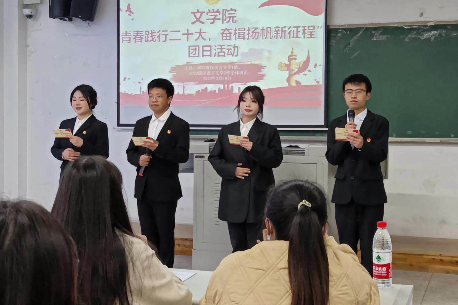 首先,由主持人带领同学们领唱团歌,在慷慨激昂的团歌声中,本次团日活动正式拉开帷幕。接着,通过观看党的纪录片,同学们更加了解了党的精神与发展历程。随着《二十大开创新征程》、《红船入梦》和《我和我的祖国》悠扬的朗诵与合唱,在场的每一位更坚定了青年要听党话,跟党走的决心;在倾听了当代“愚公”毛相林的感人肺腑故事之后,同学们深深铭记着新时代先进分子笃行不怠、吃苦耐劳的精神。紧接而来的知识竞答环节,让同学们在紧张与激情中迸发对党与国家的热忱。最后,由优秀团支书和优秀团员代表上台发言,她们精彩铿锵的发言鼓舞着同学们奋发向上,勇毅前行。