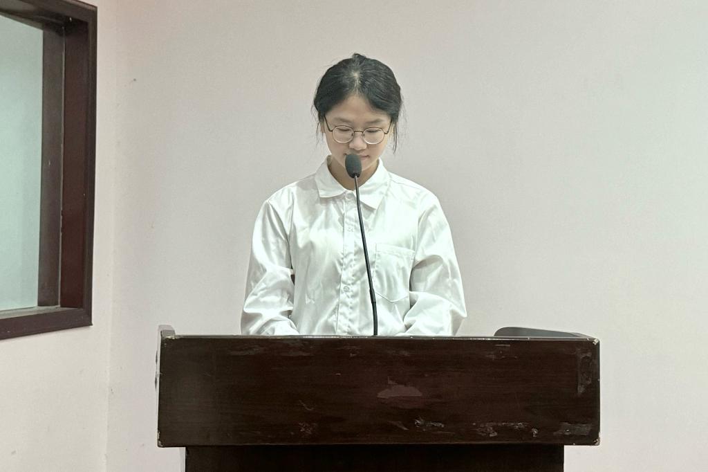 本科生新生代表龙裴熙上台发言。她代表全体大一新生表达了对老师、学长学姐的感激之情,分享诗文以共勉,号召大家珍惜大学时光,深耕博采、行稳致远,完成自律自驱的旅程。