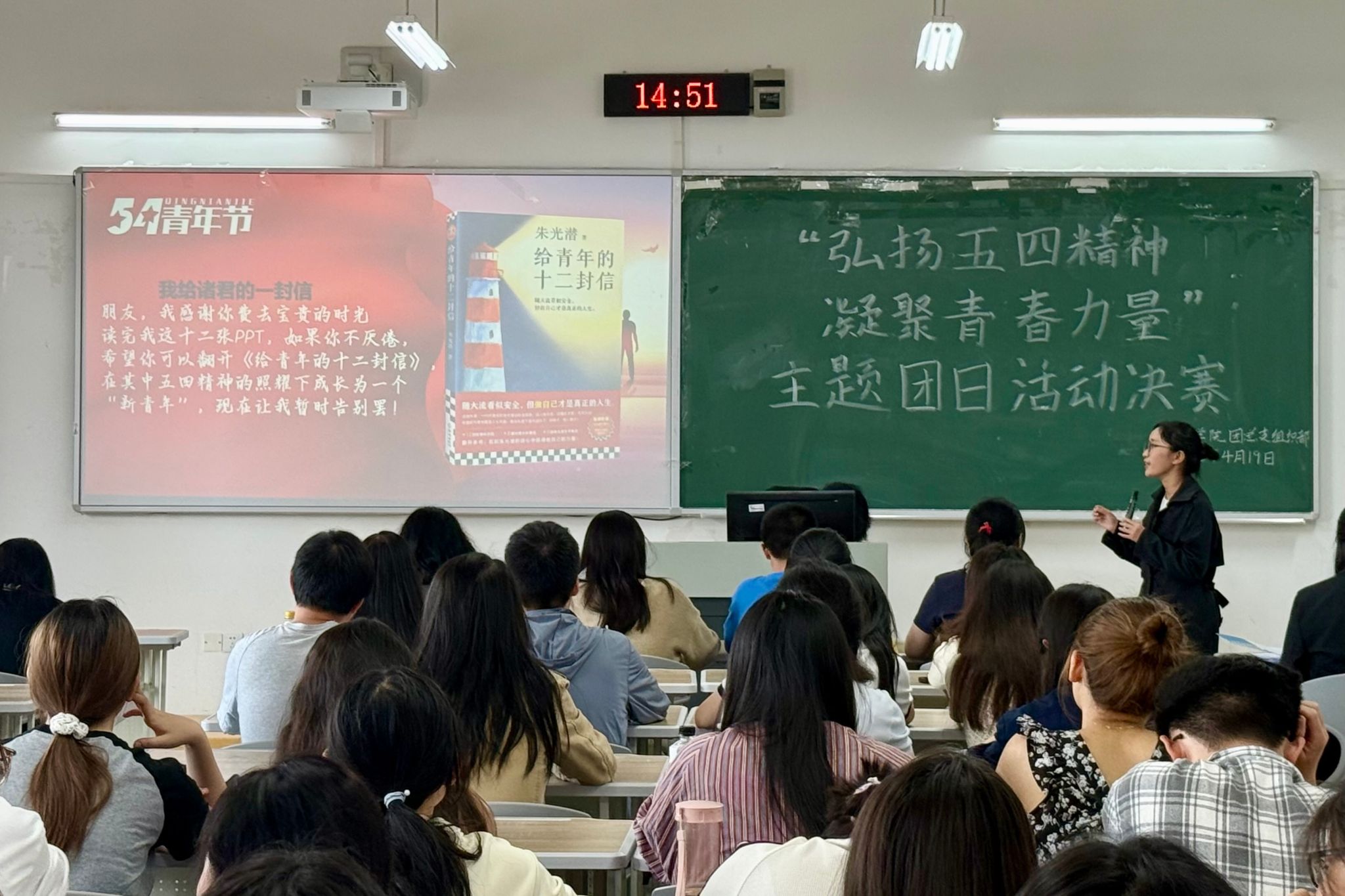 最后,组织部部长汤雨欣总结发言。她指出,此次活动不仅是知识的交流,更是一场精神的洗礼。并鼓励同学们以书为友,将活动收获转化为实际行动,牢记五四精神,在实现中华民族伟大复兴的征程中绽放青春光彩。