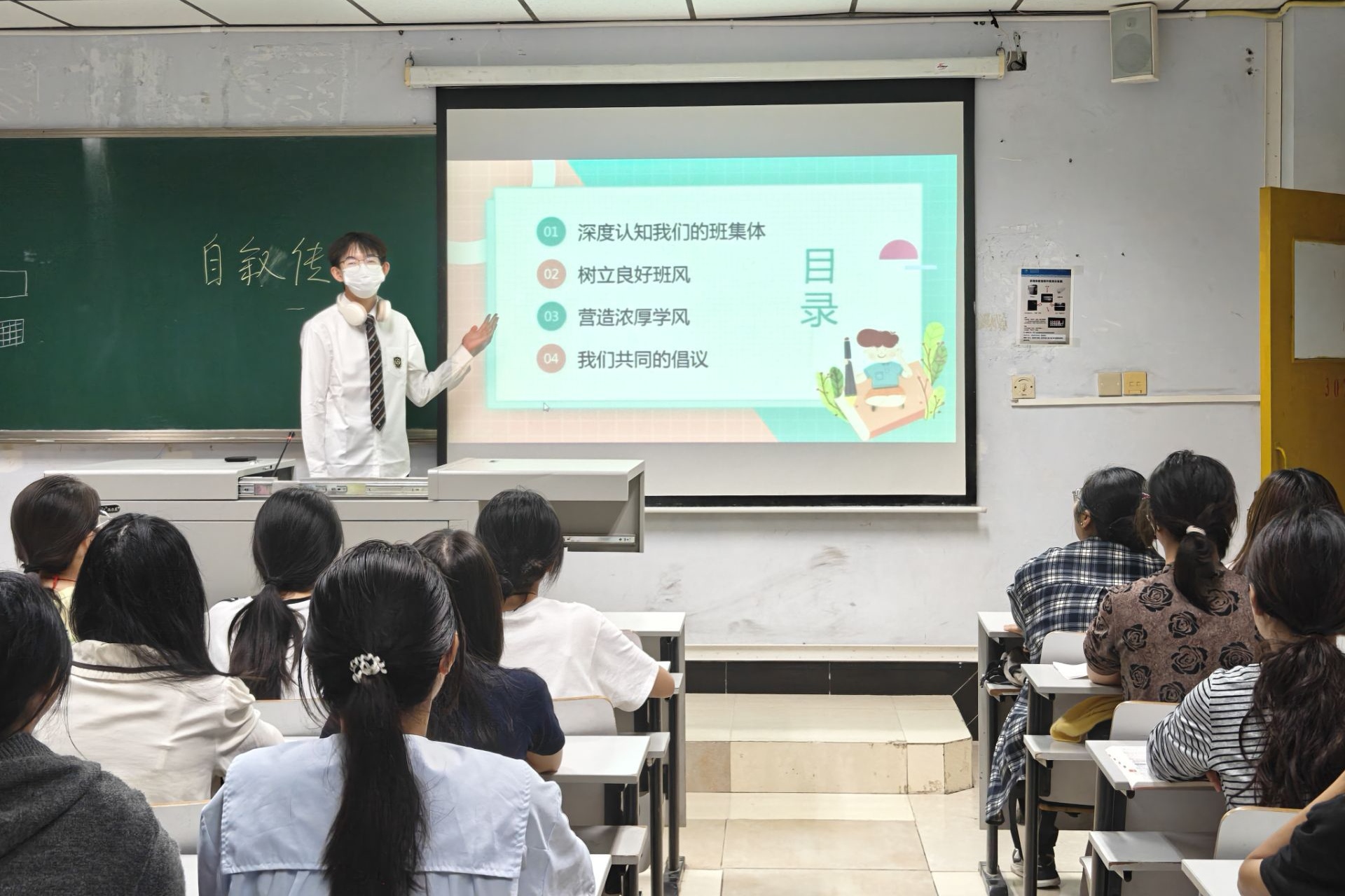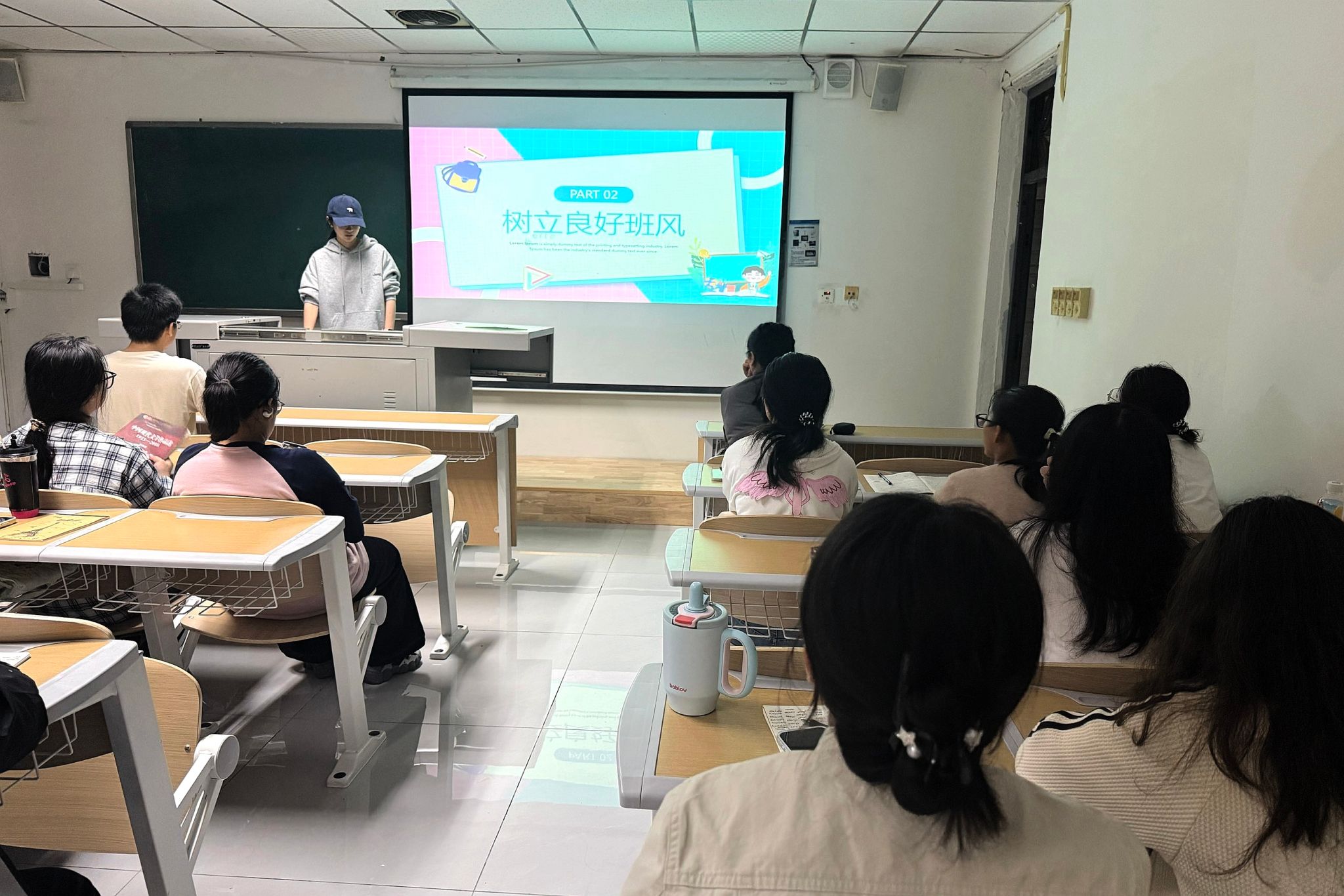 班会伊始,各年级辅导员通过“木桶原理”和学霸寝室案例引导各班同学认识到个人与集体的紧密联系。随后,在对班风和学风重要性的思考中,辅导员针对性点拨,帮助同学们意识到班风和学风的优化需要每个人补短板、扬长处,实现共同进步。接着,在“树立良好班风”环节,师生们共同探讨了班级中存在的“事不关己”“盲目效仿”等现象,借此突出强调班风建设需从尊重、信任、理解、团结四方面入手。同时,在“营造浓厚学风”环节,针对不同年级的学风问题,班会提出浓厚学风应具备的四大条件,即苦学、勤思、好问、求实。最后,各班在班级宣言中写道:“面对困难,我们勇往直前;面对失败,我们永不言弃!”响亮的宣言展现了同学们追求卓越班风学风的决心。