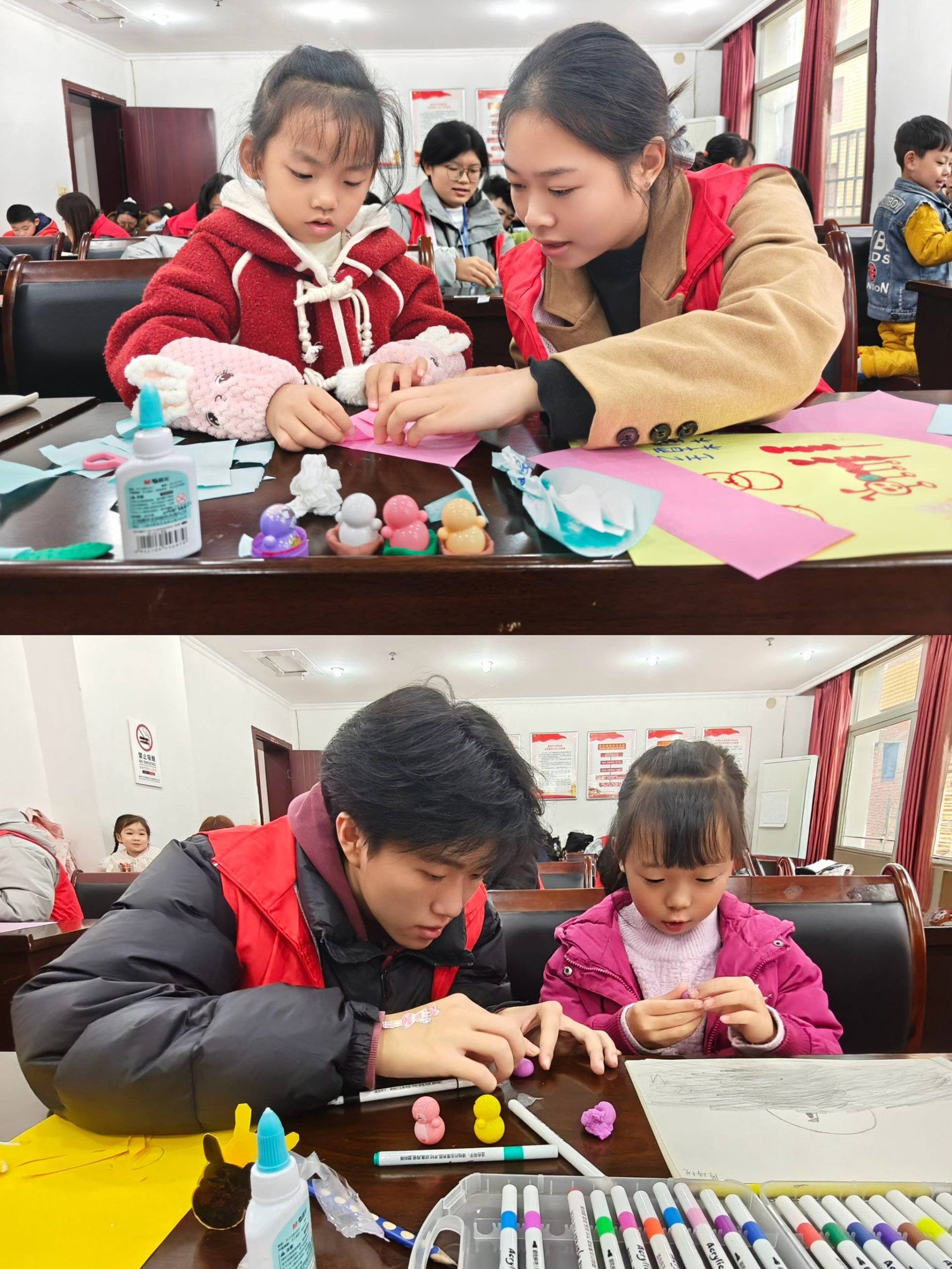 活动伊始,志愿者首先通过展示真实的不倒翁玩具,引导小朋友观察其“永不倒下”的奇妙现象,成功激发了他们的浓厚兴趣与好奇心。随后,志愿者为小朋友讲述了不倒翁背后“重心低、底部呈圆弧形”的科学原理。在理解了基本原理后,活动进入了手工制作环节。小朋友在志愿者的耐心协助下,利用分发到的瓶盖、橡皮泥、彩纸等材料,亲手制作属于自己的简便版不倒翁。在整个过程中,孩子们积极动手,将刚学到的知识转化为实践,现场气氛活跃,充满了欢声笑语。