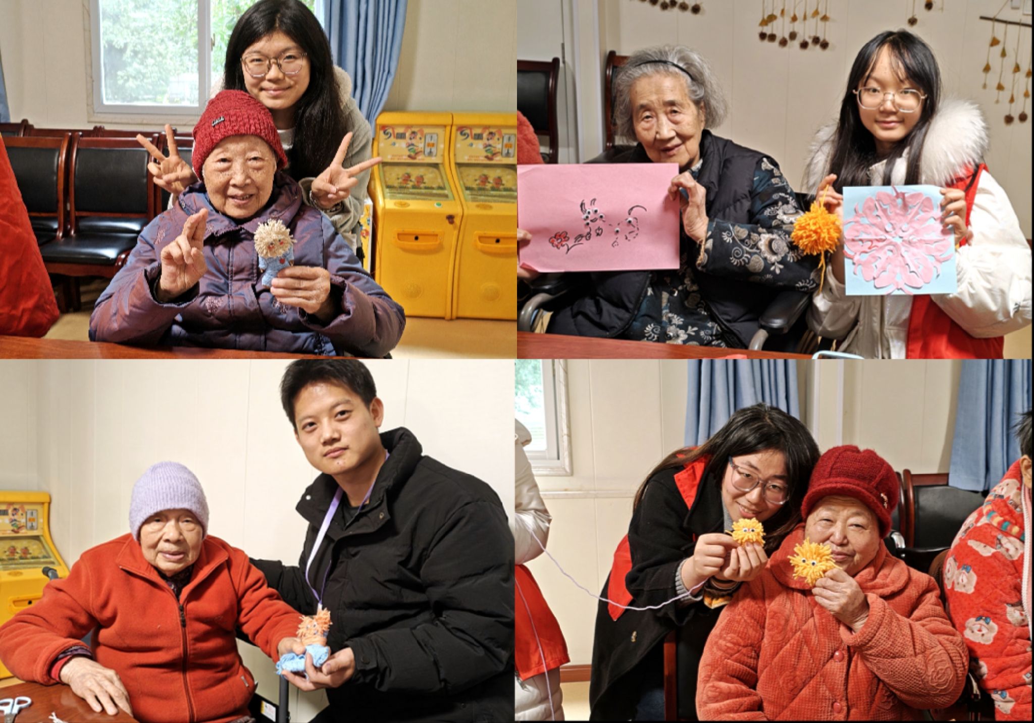 活动伊始,志愿者们陪伴老人们走出屋门,参与毛线娃娃手工活动。随后,在活动室内,志愿者们细致协助老人们制作手工,从穿针引线到塑形装饰,志愿者们将每一个步骤都耐心拆解示范。在志愿者们的协助下,老人们顺利完成各具特色的毛线娃娃成品——有的娃娃扎着俏皮羊角辫,有的缀着老人亲手缝的小纽扣,老人们捧着自己的“杰作”反复端详,成就感满满。