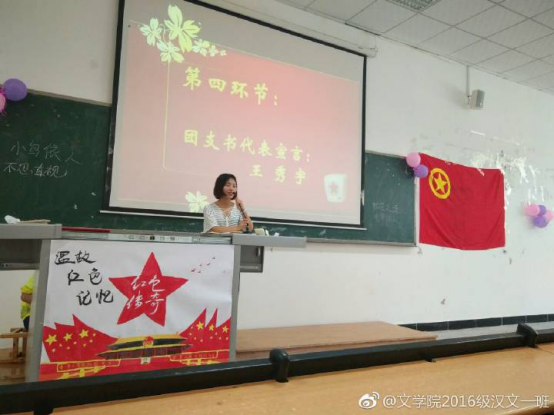 本次“温故红色记忆,传承爱国主义”团日活动由2016级汉文一班和汉文二班联合开展,主要由两个班的班委共同策划。活动内容丰富,形式多样。主要环节有红色经典文章朗诵,团支书代表宣言,红歌合唱等。团日活动的开展过程中也进行了你画我猜这样的小游戏,活跃了现场氛围,使大家在一个轻松的环境下,宣扬红色记忆,传承爱国主义。