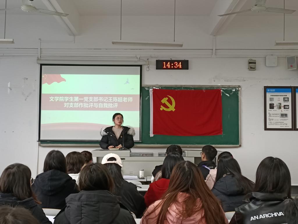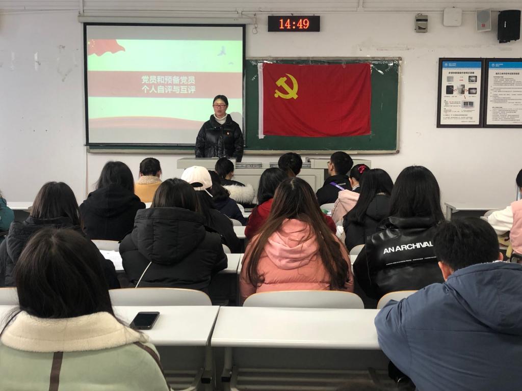 大会第二项,开展个人自评和党员互评。每位党员与预备党员对照合格党员标准、对照入党誓词、对照身边先进典型,对这一学年在政治、思想、学习、工作、能力、作风等方面开展个人自评。多数党员与预备党员充分结合理论与实践,在思想上、生活上、学习上以及群众联系等层面问题进行对照审并提出解决方案。如预备党员刘钰琴表示自己对党的知识学习理解不够透彻,对党的活动参与主动性不足,并表示要向优秀党员看齐、端正学风、加强自制能力。而后,每个党员逐一对其开展批评,接着是党员做表态发言。