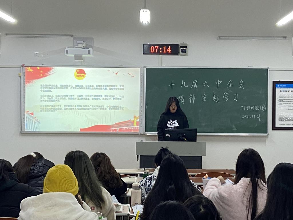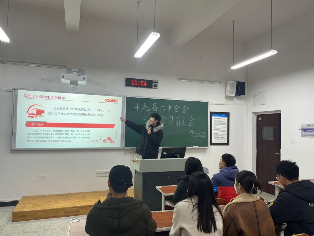 班会上,各团支书带领班级深入学习《中国共产党第十九届中央委员会第六次全体会议公报》《中共中央关于党的百年奋斗重大成就和历史经验的决议》等会议文件精神,深刻领会党的十九届六中全会的重大意义、精神实质,以及一百年来党领导人民创造的伟大成就、党百年奋斗的历史意义、积累的宝贵历史经验等。团支书强调,全体同学们要真正做到学深悟透、融会贯通,并且进一步增强“四个意识”、坚定“四个自信”、做到“两个维护”,为实现中华民族伟大复兴贡献青年的力量。