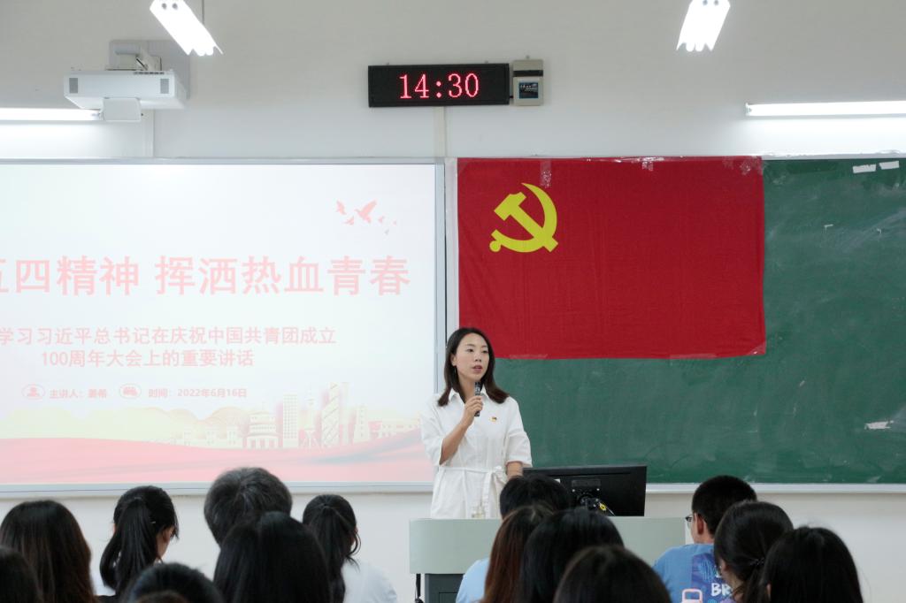 首先,姜希从中国共青团“建立、发展、辉煌”三个发展阶段、五四运动以及一二·九运动两个历史事件和六大光荣传统等方面对中国共青团的百年征程进行概述。随后,她通过一系列的关键词与大家一起重温和学习了习近平总书记在庆祝中国共青团100周年上的重要讲话精神。第一,“1个激励”“1个里程碑”“1个重要遵循”“1个重大课题”,这4个关键词所介绍的是中国共青团的成立在中国革命史和青年运动史上具有里程碑意义,所积累的宝贵历史经验是面向未来再立新功的重要遵循,为中国梦而奋斗是新时代青年运动和工作的重要课题,100周年大会激励广大团员青年在实现中国梦的新征程上奋勇前进。第二,“2个不愧为”“2个殷切期待”是指党和祖国人民对中国共青团的高度肯定和希望寄托。第三,“3种人”“3个力”是指在开展共青团工作时,各级党委(党组)要做青年朋友的知心人、青年工作的热心人、青年群众的引路人,共青团要增强引领力、组织力、服务力,成为新时代好青年。第四,“4个重要功勋”“4个始终成为”“4个塑造”是指中国共青团在百年征程中所获得的历史性成就,所塑造的立身之本、动力之源等以及习近平总书记对共青团提出的4点希望。