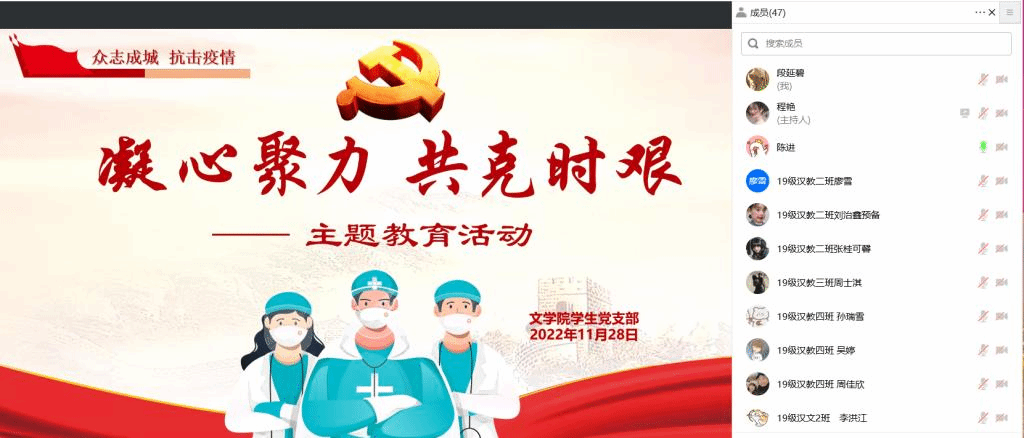 为落实全市高校疫情防控工作视频会、全市高校安全稳定工作视频会精神,做好特殊时期校园员工安全稳定工作,11月28日,公司党总支员工党支部开展了“凝心聚力,共克时艰”线上主题教育活动。