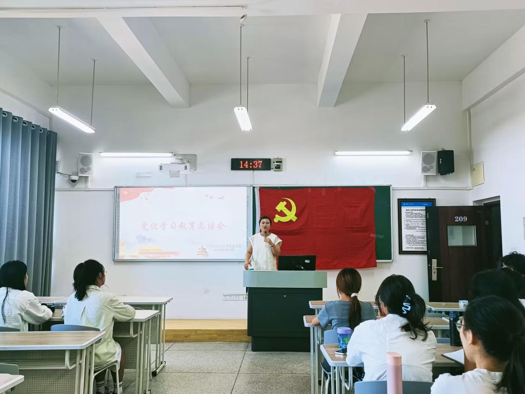 党支部书记张悦在会上总结了开展党纪学习教育的背景、意义及内容等方面,强调了身为党员同志,应主动、自觉进行党纪学习,学习了解《中国共产党纪律处分条例》的重要性及必要性。党支部书记陈进指出,在日常生活中党员们应该加强对于纪律条例的了解与落实,将政治纪律、组织纪律、廉洁纪律、群众纪律、工作纪律和生活纪律贯彻于实践中,以此不断增强自身的党纪意识建设。