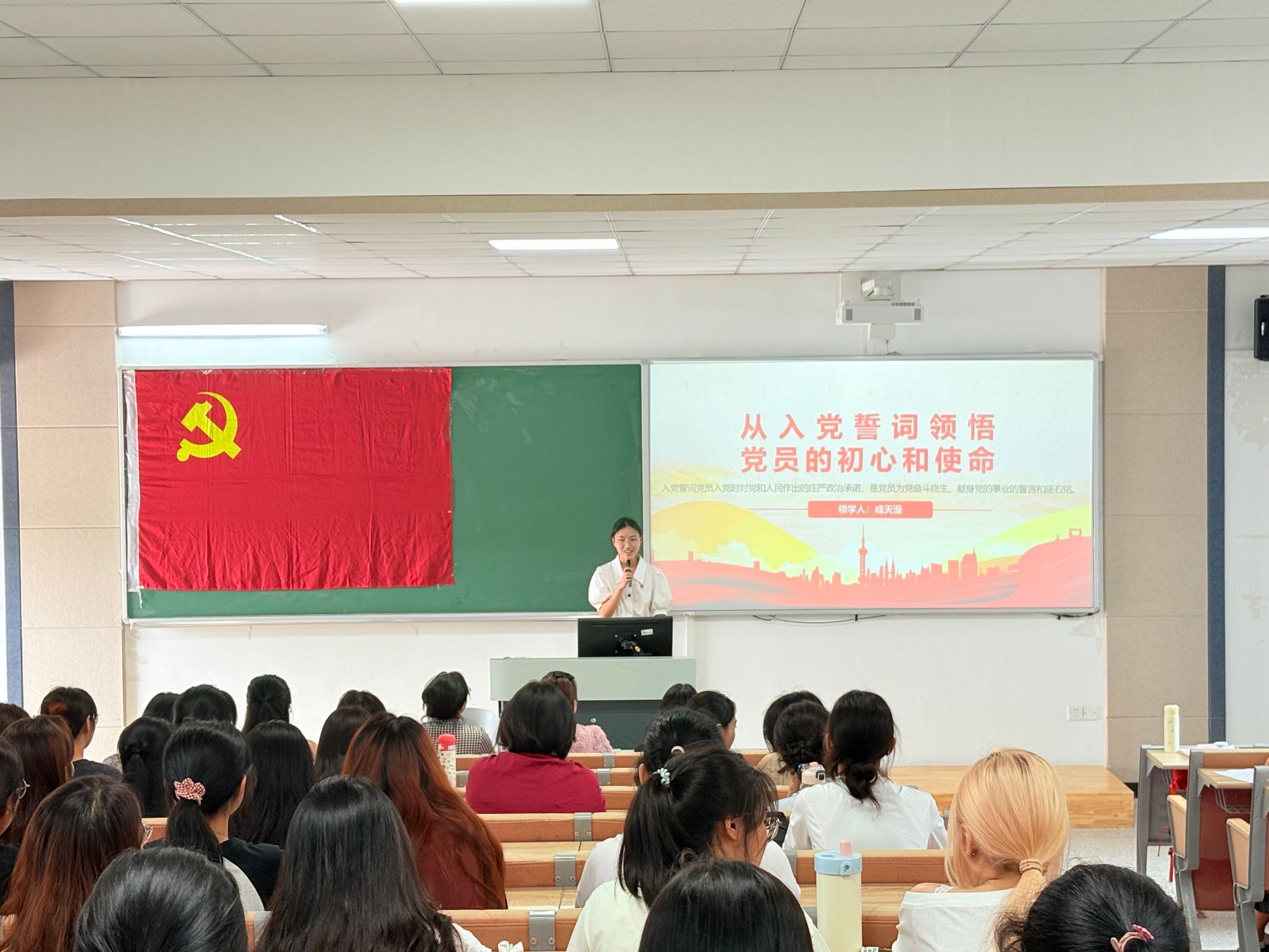 周子钦站于前方,右手握拳举过肩头,面向党旗,带领第18期预备党员宣读入党誓词。她表示,今天新一批同志光荣加入党组织。从这一刻起,你们的肩上多了一份沉甸甸的责任。入党誓词的每一字、每一句,都凝结着共产党人的初心与使命。希望你们以优秀党员同志为榜样,主动学习党的理论,在实践中锤炼本领,用实际行动诠释“请党放心,强国有我”的青春誓言。